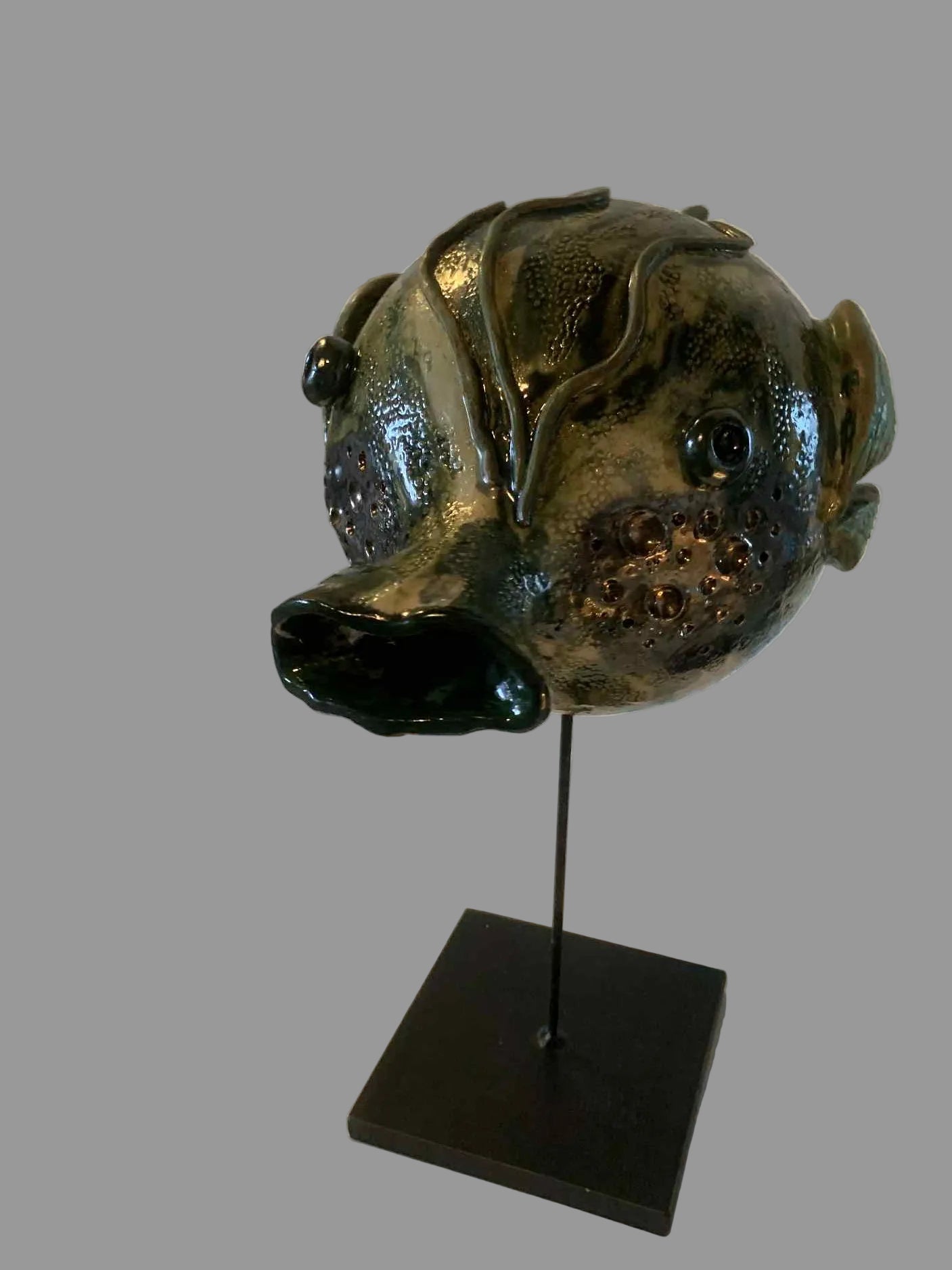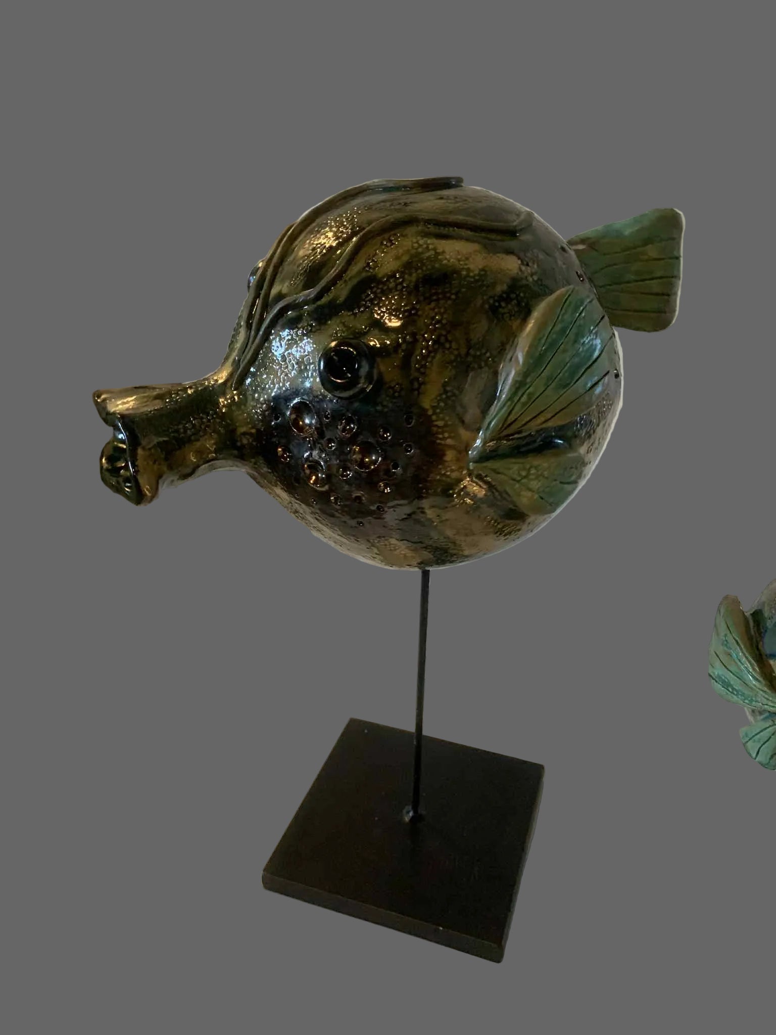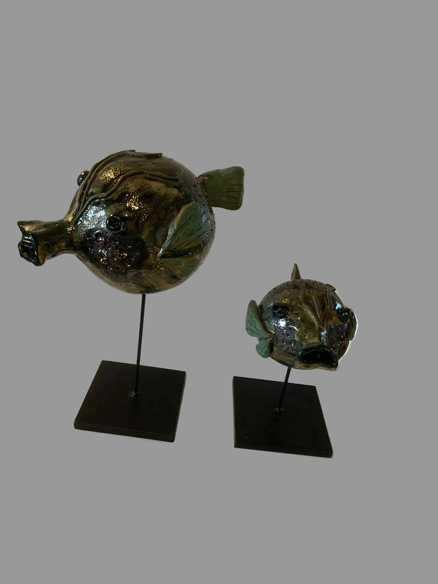 Fiskene er formet i hvidt stentøj og glaseret i forskellige grønne nuancer - har desuden effekt med stål/“guld”