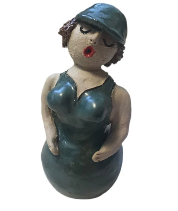 Denne syngende jomfru har fået en grøn glasur. Hatten er er en kasket